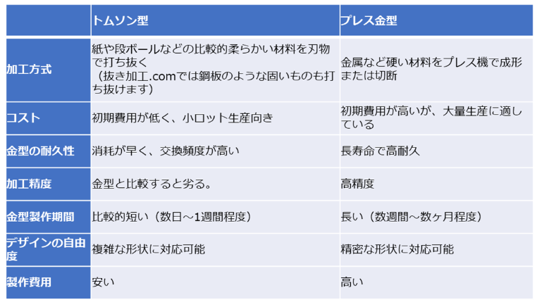 プレス抜き金型は金属を工作機械で加工して作ります。でトムソン型は木材をベースとした板に掘った溝に、刃を埋め込むことで作られます。ここでは、それぞれの方を比較し他メリットについて解説します。